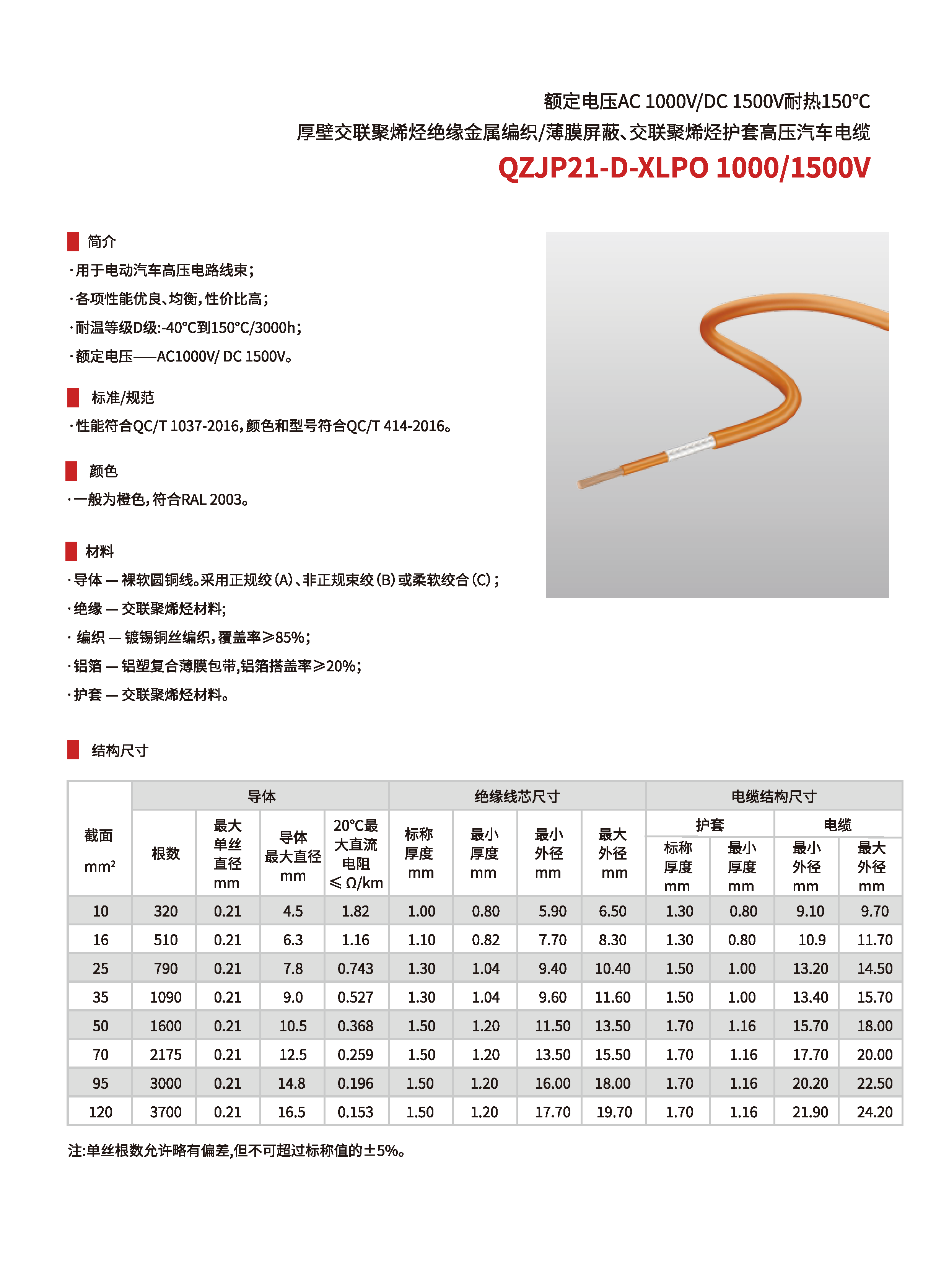| QZJP21-D/XLPO 1000/1500V | 耐溫-40~150℃厚壁交聯(lián)聚烯烴絕緣金屬編織屏蔽/薄膜屏蔽、交聯(lián)聚烯烴護(hù)套電纜 | 10~120mm2 | 1芯 | AC 1000/DC 1500V |