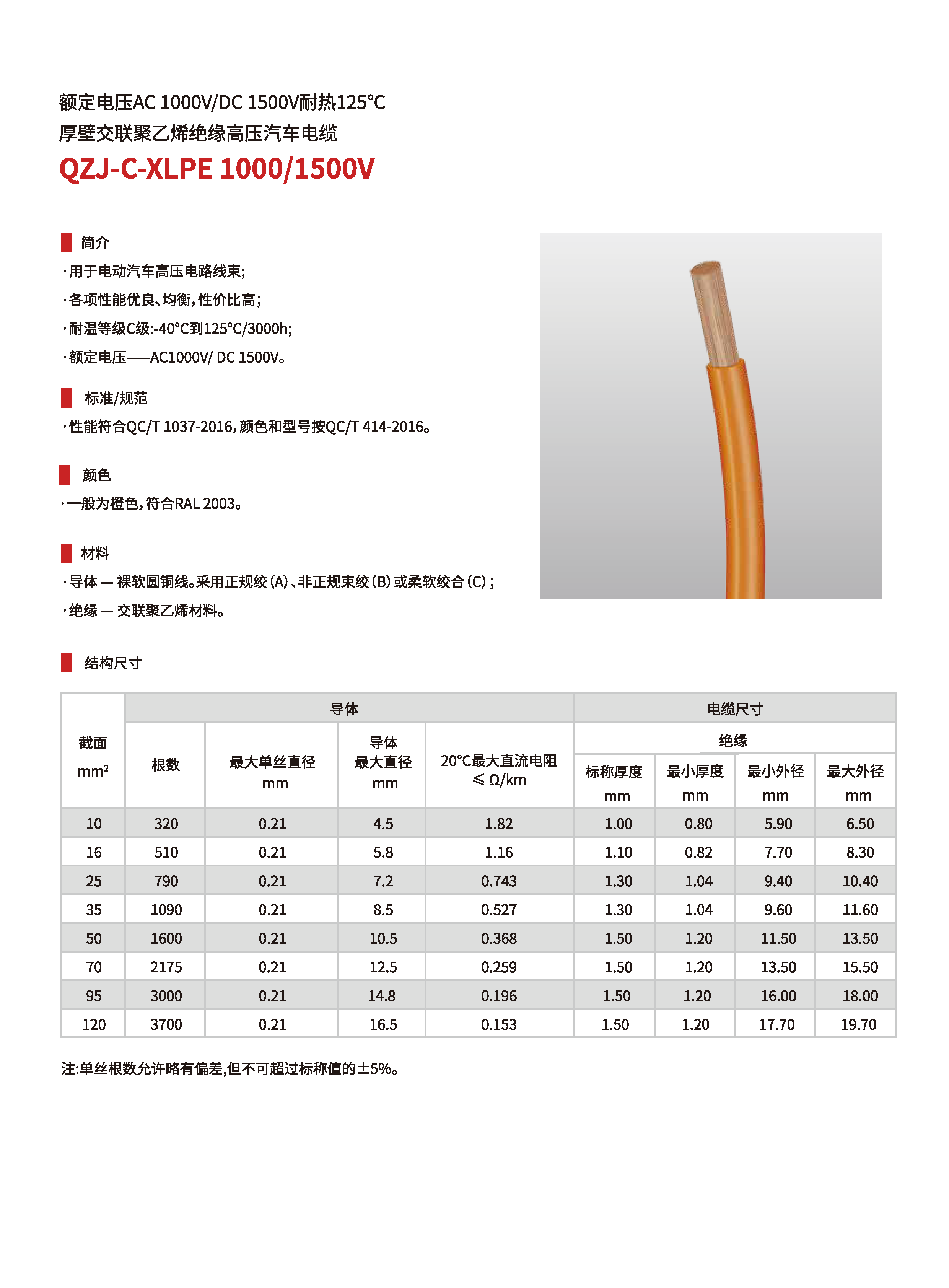 | QZJ-C/XLPE 1000/1500V | 耐溫-40~125℃厚壁交聯(lián)聚乙烯絕緣電纜 | 10~120mm2 | 1芯 | AC 1000/DC 1500V |