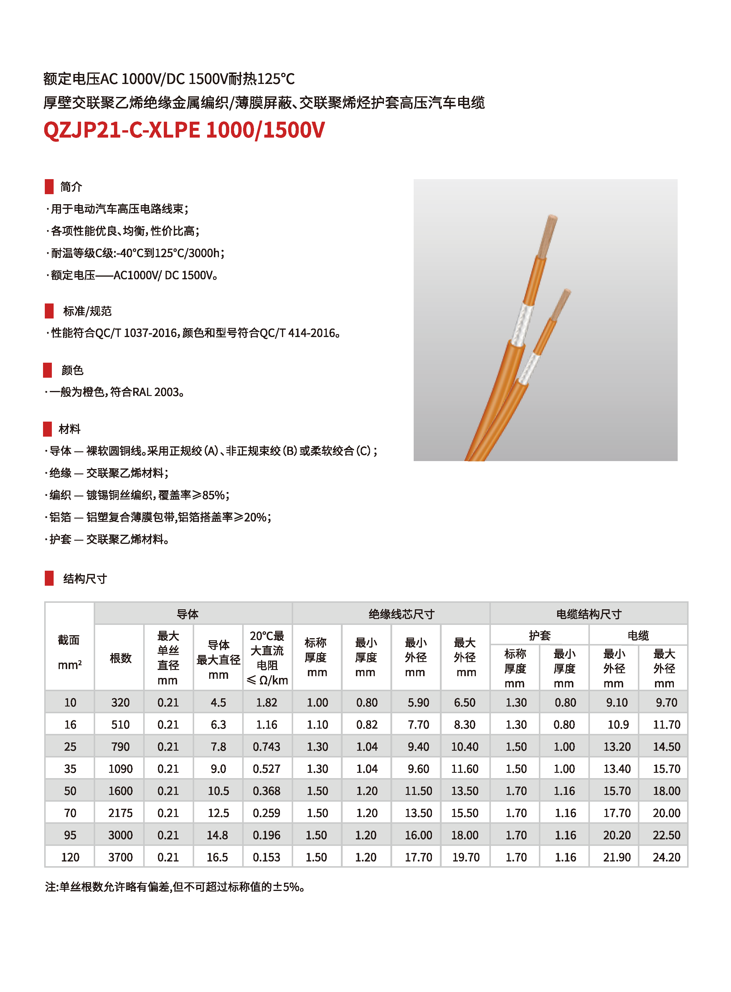 | QZJP2-C/XLPE 1000/1500V | 耐溫-40~125℃厚壁交聯(lián)聚乙烯絕緣金屬編織屏蔽、交聯(lián)聚烯烴護(hù)套電纜 | 10~120mm2 | 1芯 | AC 1000/DC 1500V |