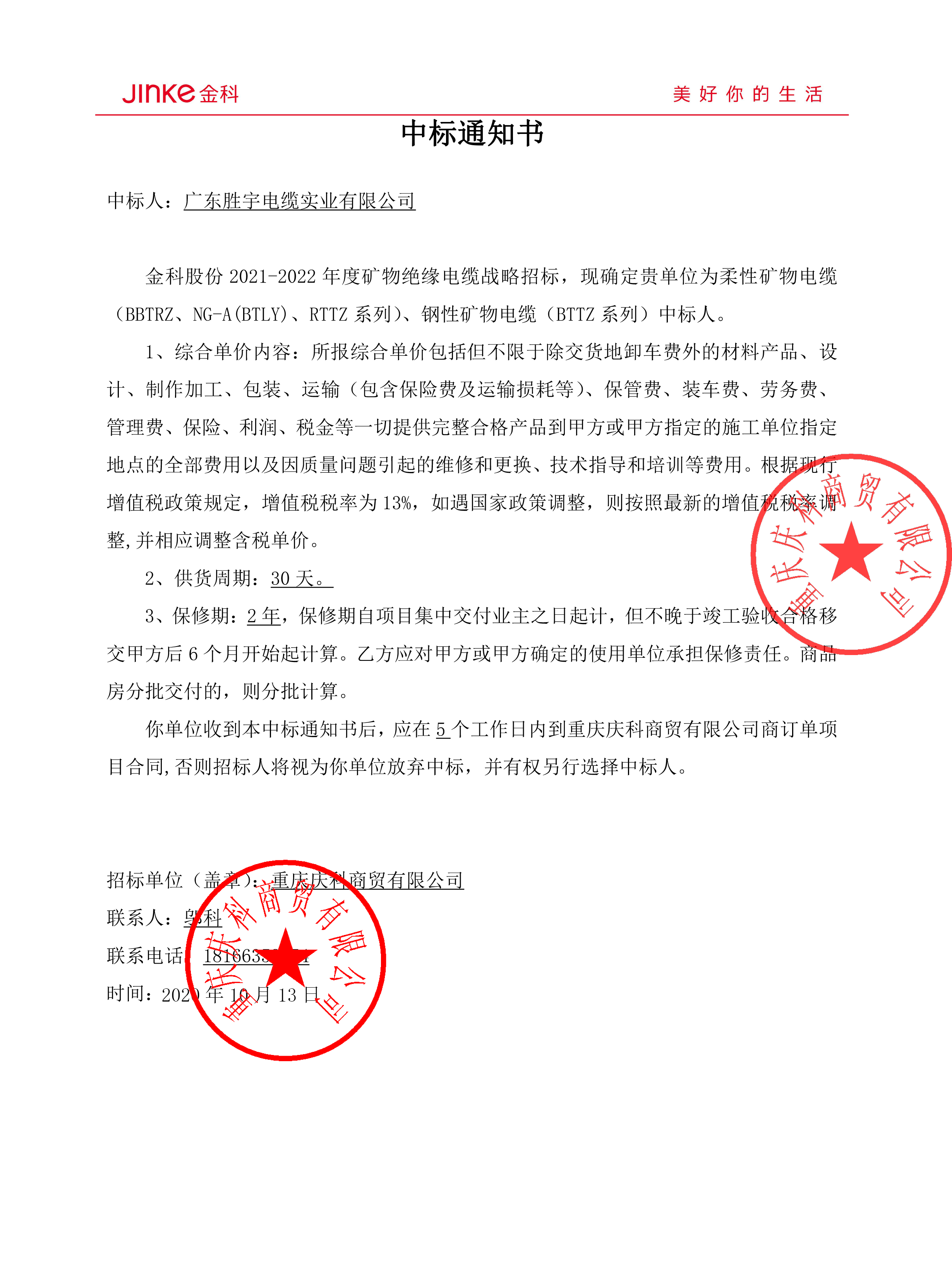 2020年10月13日,勝宇電纜中標金科股份集團2021-2022年度礦物絕緣電纜戰(zhàn)略招標,這是繼去年中標華南區(qū)域年度標后,雙方在全國市場的進一步深化合作!本次中標范圍涉及0.6/1kV NG-A(BTLY)、RTTZ、BBTRZ柔性礦物絕緣電纜、750V BTTZ剛性礦物絕緣電纜。